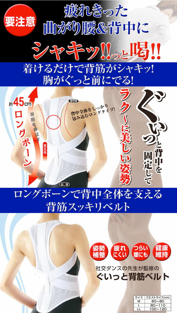 この背筋ベルトは肩甲骨の間を押さえ胸を広げるアーチパッドと仙骨まで伸びるロングボーンで猫背をピンっと伸ばし、背筋をシャキっとさせ美しい姿勢をサポートするベルトです」※個人の感想です。