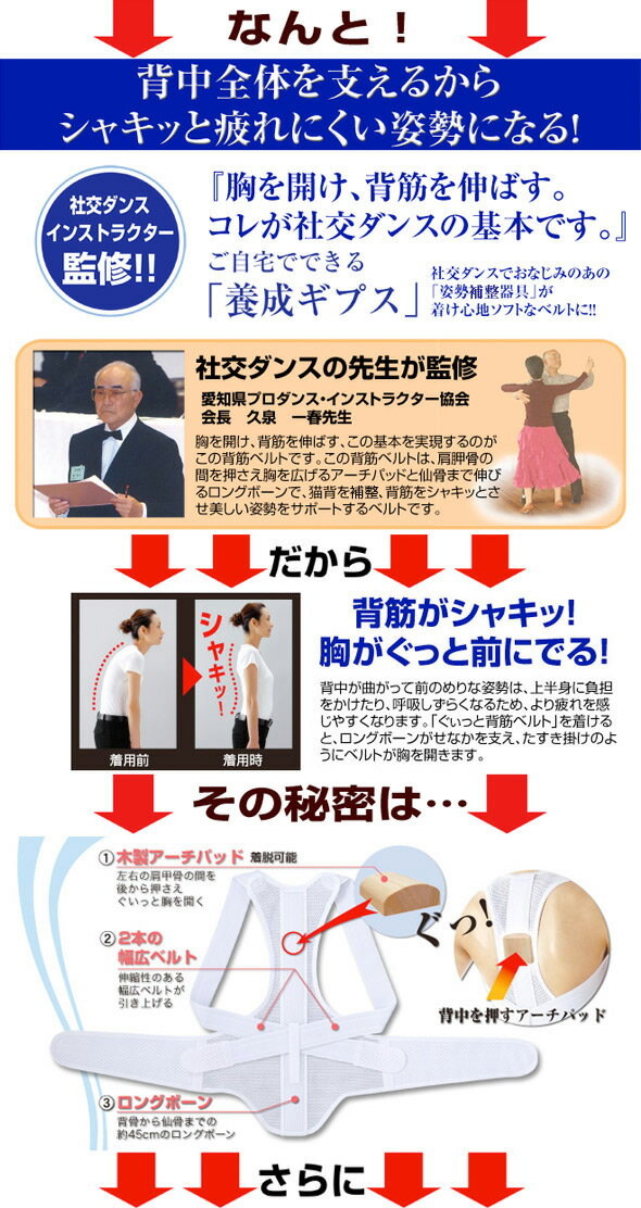 肩・背中もらくらく、姿勢きれいに!伸縮性のある幅広ベルトなのでソフトな付けごこち、なのに効果は抜群!愛知県プロダンスインストラクター協会会長久泉一春先生「胸を広げ、腰を伸ばす。