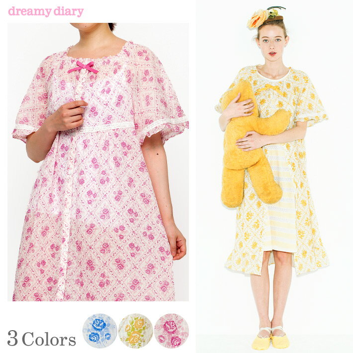 シャーリング花柄 前開き 半袖ネグリジェ【dreamydiary】(綿/コットン/涼しい/夏/ルームウェア/パジャマ/ロング/ワンピース/入院/マタニティ/産後/ギフト/プレゼント)