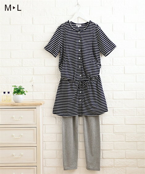 【授乳服 マタニティ パジャマ】(mutti ei)【授乳口付】天竺ボーダー半袖パジャマ【前開き ホームウェア ナイティ マタニティ パジャマ 半袖 授乳服 妊婦服 マタニティー 春 夏 春夏】