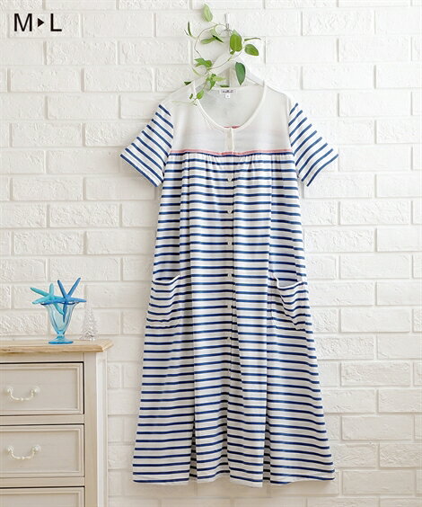 マタニティウェア・授乳服 【産前・産後 授乳服】mutti ei 前開きボーダー切替え半袖ネグリジェ ニッセン nissen