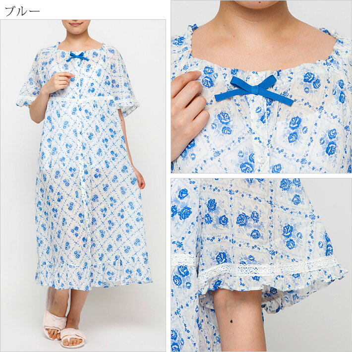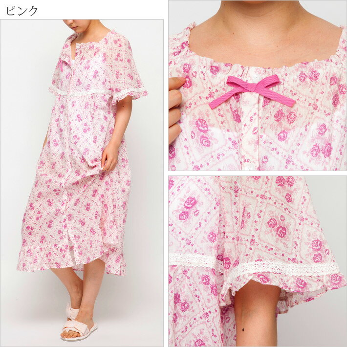 メーカー希望小売価格はメーカーサイトに基づいて掲載していますシャーリング 花柄 前開き 半袖ネグリジェ ダイヤ型のチェック模様の中に、薔薇の花が咲くロマンティックなデザインのロングワンピース。