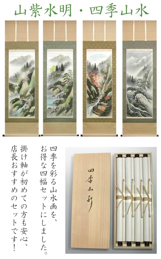 【画 題】山紫水明・四季山水 【解 説】春・夏・秋・冬、それぞれの良き風情を織り込んだ、心に響く山水画のセットです。